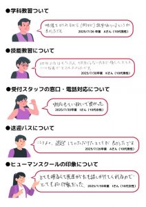 【松浦校】卒業生の声(2025年7月後半) 2025.08.26 / お知らせ 2025年7月後半にヒューマンスクール松浦を卒業した皆様より、 たくさんの声をいただきましたので一部ご紹介いたします。 ご卒業おめでとうございます! 免許取得後も快適なカーライフを送られますよう、スタッフ一同心よりお祈り申し上げます。 アンケートへのご協力ありがとうございました。 💡各SNSも毎日発信中です!是非ご覧ください💡 Instagram、TikTok、YouTube 前の記事 次の記事 一覧へもどる