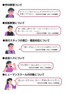 【松浦校】卒業生の声(2025年8月) 2025.10.02 / お知らせ 2025年8月にヒューマンスクール松浦を卒業した皆様より、 たくさんの声をいただきましたので一部ご紹介いたします。 ご卒業おめでとうございます! 免許取得後も快適なカーライフを送られますよう、スタッフ一同心よりお祈り申し上げます。 アンケートへのご協力ありがとうございました。 💡各SNSも毎日発信中です!是非ご覧ください💡 Instagram、TikTok、YouTube 前の記事 次の記事 一覧へもどる