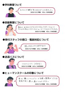 【松浦校】卒業生の声(2025年12月前半) 2025.12.25 / お知らせ 2025年12月前半にヒューマンスクール松浦を卒業した皆様より、 たくさんの声をいただきましたので一部ご紹介いたします。 ご卒業おめでとうございます! 免許取得後も快適なカーライフを送られますよう、スタッフ一同心よりお祈り申し上げます。 アンケートへのご協力ありがとうございました。 💡各SNSも毎日発信中です!是非ご覧ください💡 Instagram、TikTok、YouTube 前の記事 次の記事 一覧へもどる