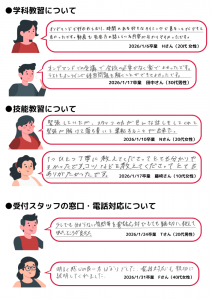 【早岐校】卒業生の声(2026年1月) 2026.02.25 / お知らせ 2026年1月にヒューマンスクール早岐を卒業した皆様より、 たくさんの声をいただきましたので一部ご紹介いたします。 ご卒業おめでとうございます! 免許取得後も快適なカーライフを送られますよう、スタッフ一同心よりお祈り申し上げます。 アンケートのご協力ありがとうございました。 💡各SNSも毎日発信中です!是非ご覧ください💡 Instagram、TikTok、YouTube 前の記事 次の記事 一覧へもどる