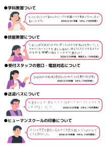 【松浦校】卒業生の声(2026年2月) 2026.02.25 / お知らせ 2026年2月にヒューマンスクール松浦を卒業した皆様より、 たくさんの声をいただきましたので一部ご紹介いたします。 ご卒業おめでとうございます! 免許取得後も快適なカーライフを送られますよう、スタッフ一同心よりお祈り申し上げます。 アンケートへのご協力ありがとうございました。 💡各SNSも毎日発信中です!是非ご覧ください💡 Instagram、TikTok、YouTube 前の記事 一覧へもどる
